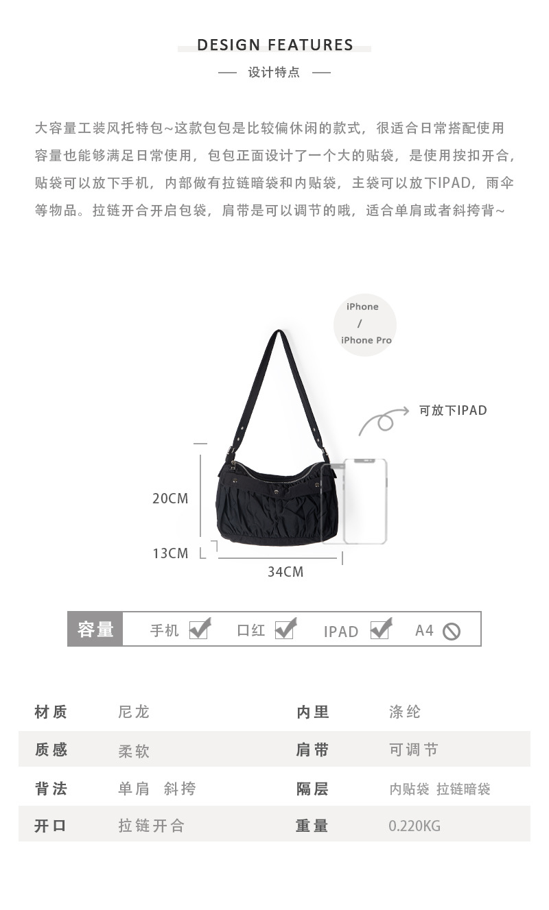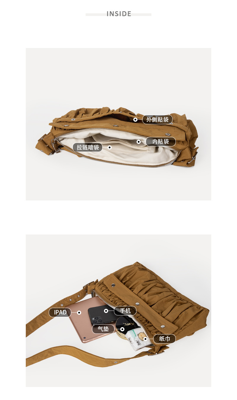 Crossbody bag for women summer large-capacity workwear tote bag 2023 women's niche design pleated nylon shoulder bag