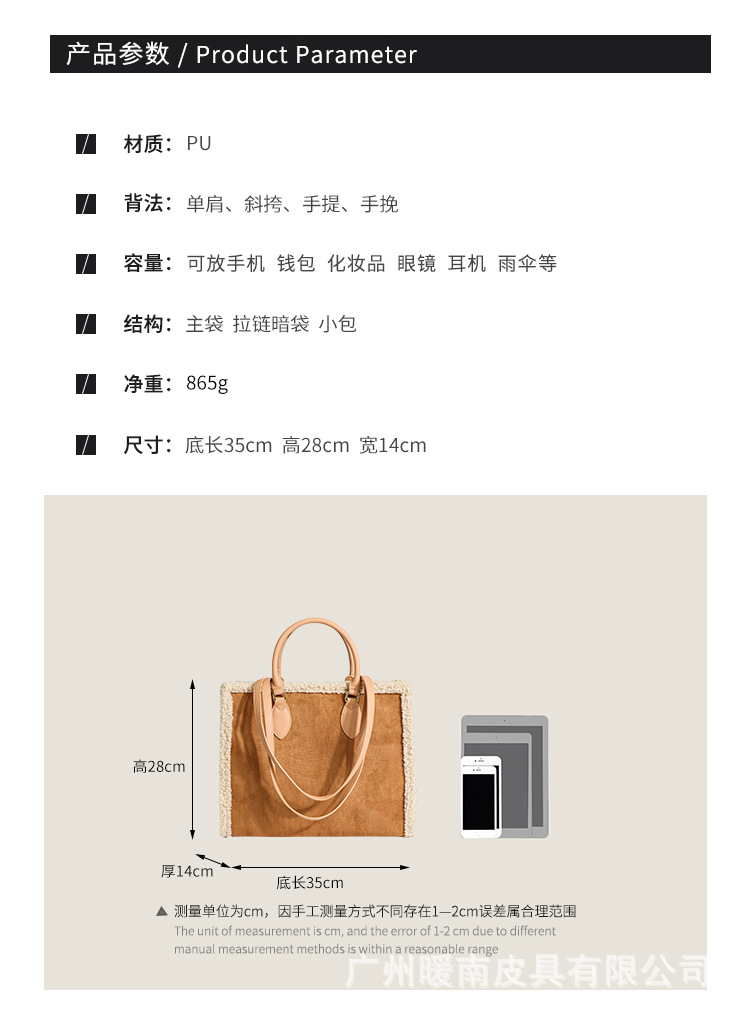 Lamb Wool Handbag 2023 Fashion New Trendy Shoulder Crossbody Hand-held Large Capacity Women's Bag Tote Bag