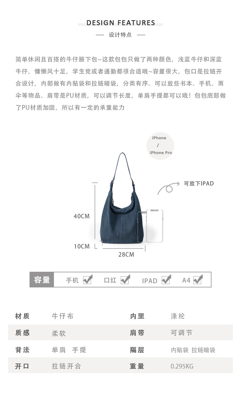 New trendy Korean style large-capacity denim bag women's bag tote bag niche design casual versatile commuter shoulder bag