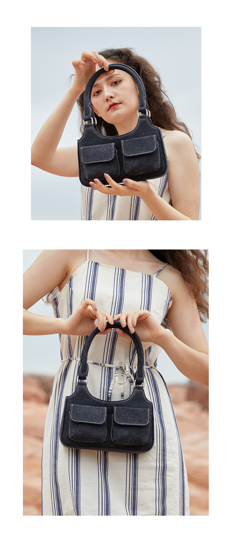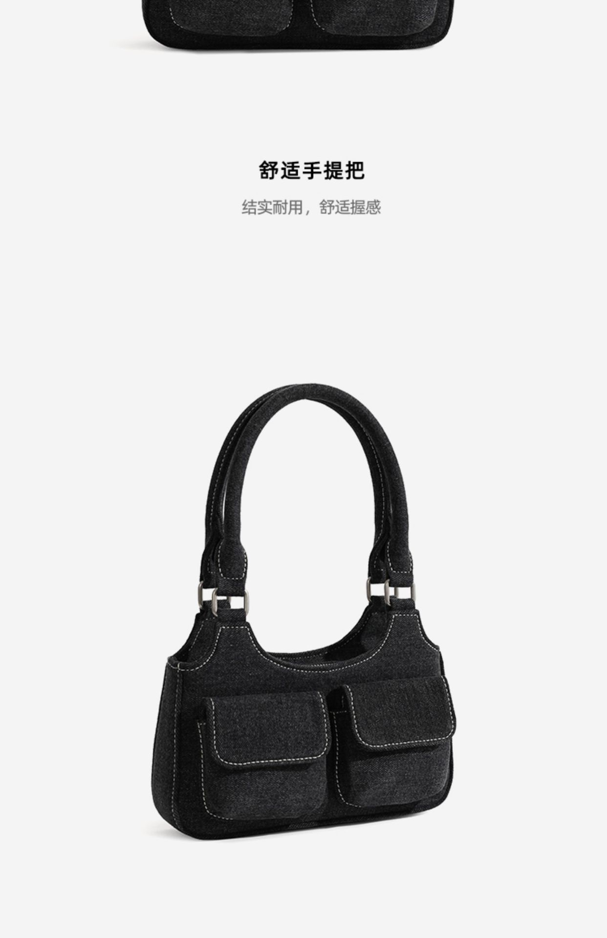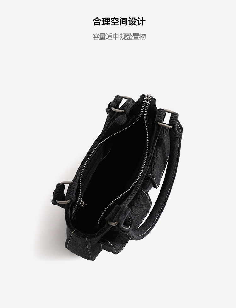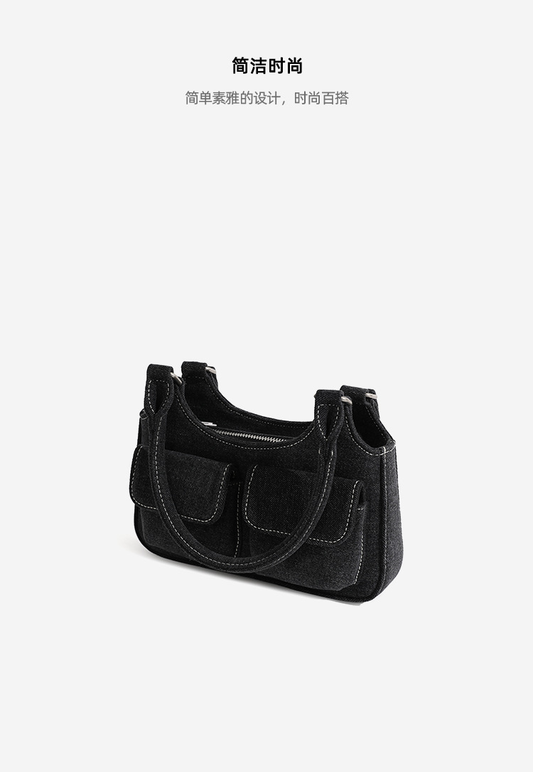 European and American niche bag college style hot girl double pocket dark denim blue small retro handbag single shoulder armpit bag